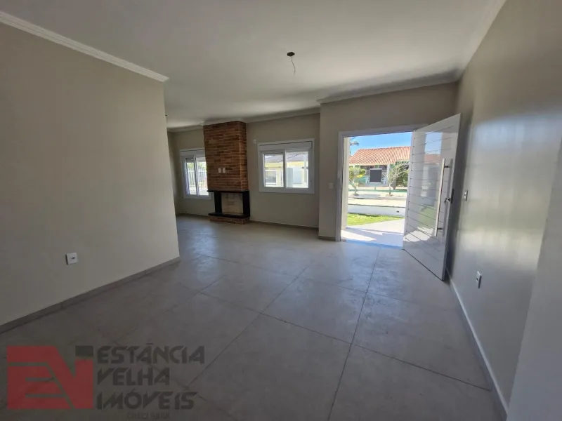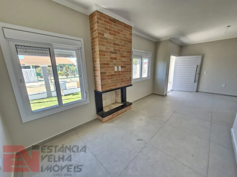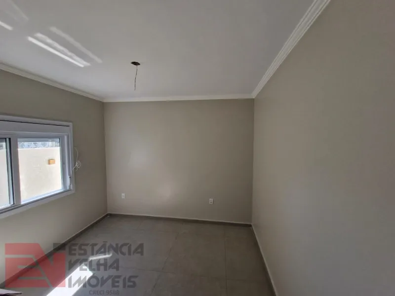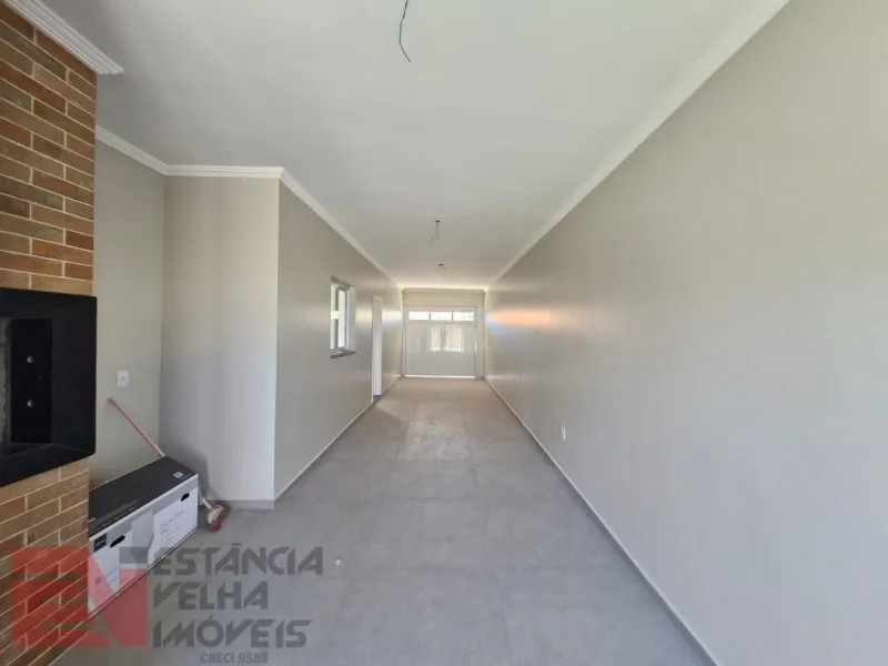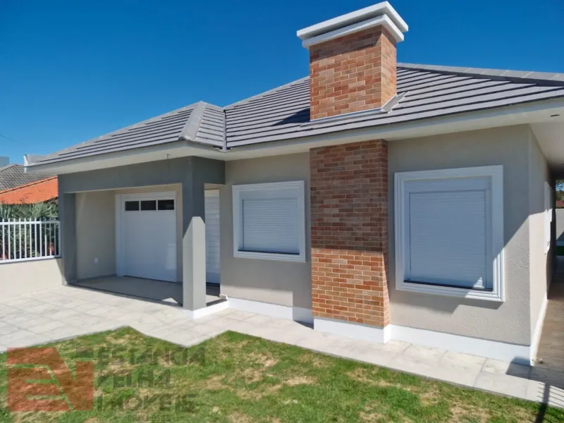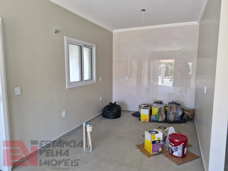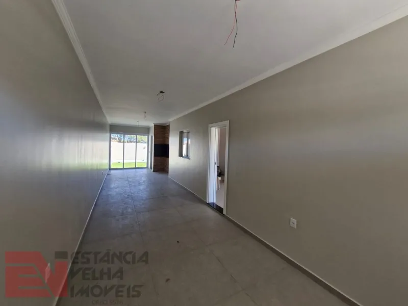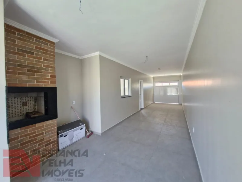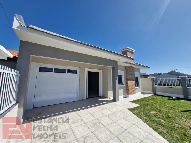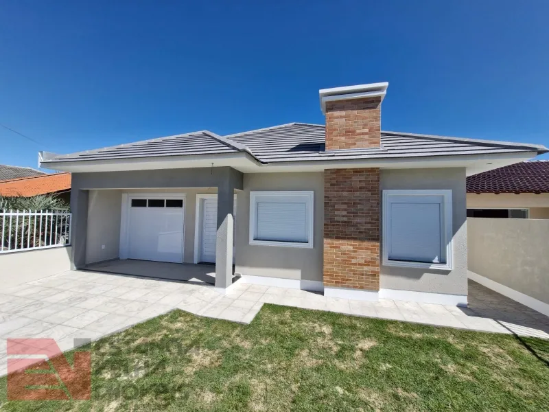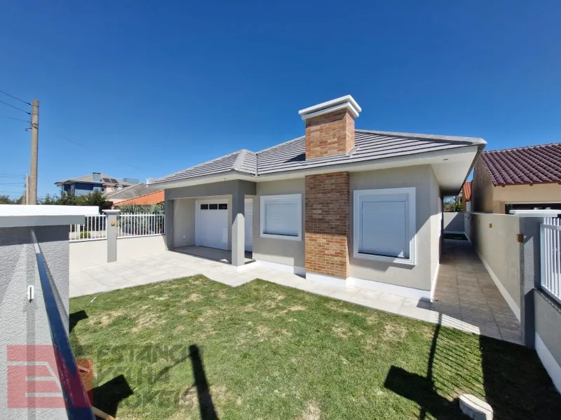 Casa de alvenaria toda em laje de concreto, composta por 3 dormitórios (sendo 1 suíte), sala de estar e jantar integradas, cozinha americana, churrasqueira, 1 banheiro social, 1 lavabo, área de serviço garagem fechada para 2 carros e estacionamento para 1 carro. Possui excelente padrão de acabamento, sendo piso porcelanato em todo imóvel, esquadrias em pvc, roda teto em gesso. Terreno todo murado e cercado, medindo 12x25 metros, com área total de 300 m².